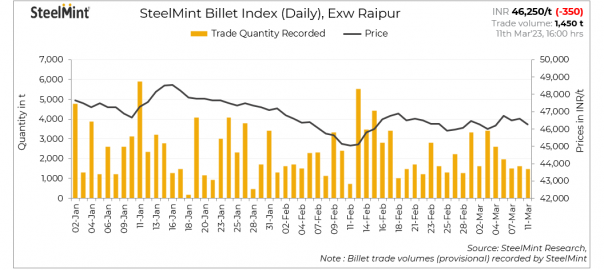SteelMint’s daily steel billet index was assessed at INR 46,250/tonne (t) exw-Raipur on 11 March, 2023, a decrease of INR 350/t d-o-d.