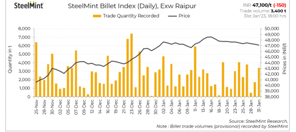 SteelMint’s billet index declined by INR 150/tonne (t) d-o-d to INR 47,100/t exw-Raipur on 31 January, 2023.