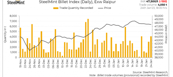 SteelMint’s billet index declined by INR 150/t d-o-d to INR 47,500/tonne (t) exw-Raipur on 24 January, 2023.
