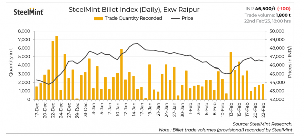 SteelMint’s billet index fell by INR 100/tonne (t) to INR 46,500/t exw-Raipur on 22 February 2023.
