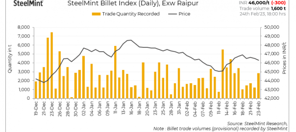 SteelMint’s billet index fell by INR 300/tonne (t) to INR 46,000/t exw-Raipur on 24 February, 2023.