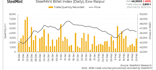 SteelMint’s daily steel billet index was assessed at INR 46,300/tonne (t) exw-Raipur, a decrease of INR 200/t d-o-d on 23 February, 2022.