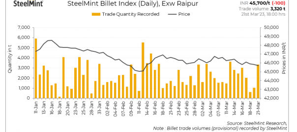 SteelMint’s billet index declined by INR 100/t to INR 45,700/tonne (t) exw-Raipur on 21 March, 2023.