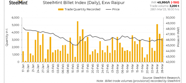SteelMint’s daily steel billet index fell by INR 150/t to INR 45,950/t on March 28, 2023.