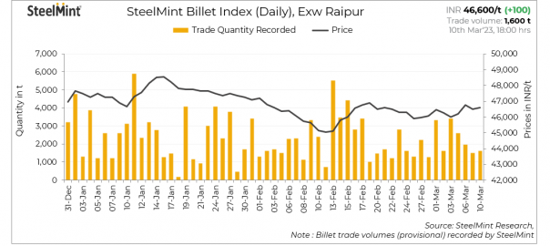 SteelMint recorded a total of 1,600 t of billets in Raipur as against 1,500 t as reported on 6 March.