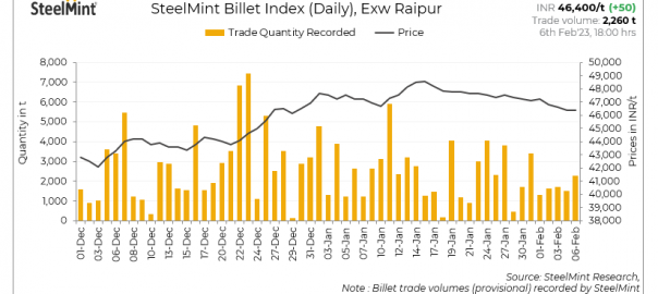 SteelMint’s billet index moved up marginally by INR 150/t to INR 46,400/tonne (t) exw-Raipur on 6 February, 2023.