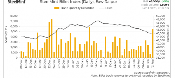 SteelMint’s billet index moved up marginally by INR 50/tonne (t) to INR 45,100/t exw-Raipur on 13 February, 2023.