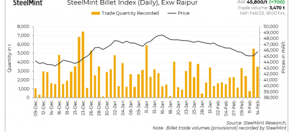 SteelMint’s billet index rose sharply by INR 700/tonne (t) to INR 45,800/t exw-Raipur on 14 February, 2023.