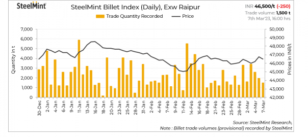 SteelMint’s billet index decreased by INR 250/t d-o-d to INR 46,500/tonne (t) exw-Raipur on 7 March, 2023.