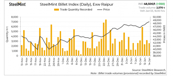 SteelMint’s billet index rose by INR 350/tonne (t) to INR 48,500/t exw-Raipur on 14 January, 2023.