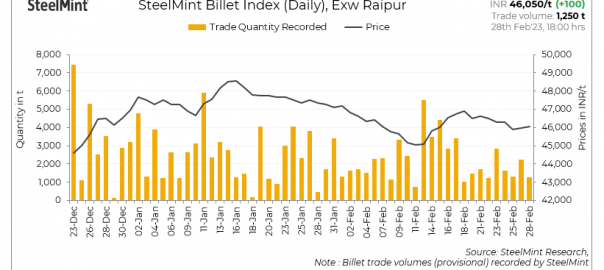 SteelMint’s billet index increased by INR 100/t to INR 46,050/tonne (t) exw-Raipur on 28 February, 2023.