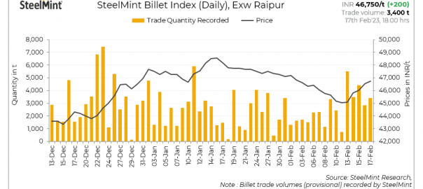 SteelMint’s billet index increased by INR 200/t to INR 46,750/tonne (t) exw-Raipur on 17 February, 2023.