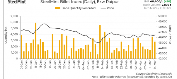 SteelMint’s billet index increased slightly by INR 50/t d-o-d to INR 46,400/tonne (t) exw-Raipur on 14 March, 2023.