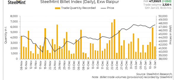 SteelMint’s billet index rose by INR 250/tonne (t) to INR 47,550/t exw-Raipur on 12 January, 2023.
