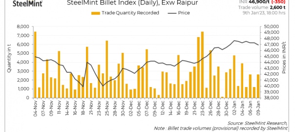 SteelMint’s billet index declined to INR 46,900/tonne (t) (- INR 350) exw-Raipur on 9 January, 2023.