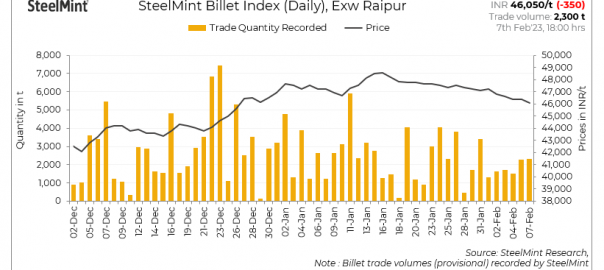 SteelMint’s billet index dropped INR 350/t to INR 46,050/tonne (t) exw-Raipur on 7 February, 2023.