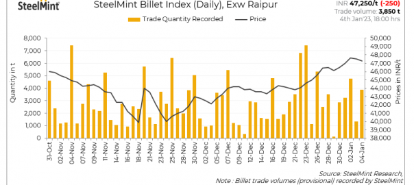 SteelMint’s daily steel billet index has decreased to INR 47,250/tonne (t) (- INR 250/-) d-o-d exw-Raipur on 4 January, 2023.