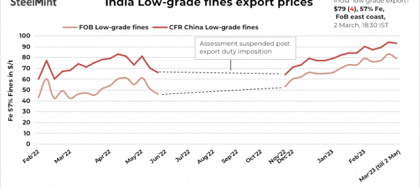 SteelMint’s weekly index of India’s low-grade iron ore fines (Fe 57%) exports stood at $79/tonne (t) FOB east coast on 2 March, 2023, down $4/t w-o-w. Export prices declined this week due to fall in spot prices w-o-w along with policy changes in China.