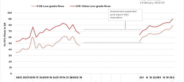 SteelMint’s weekly price index of India’s low-grade iron ore fines (Fe 57%) exports stood at $79/tonne (t) FOB east coast on 19 January, 2022, up $6/t w-o-w. Prices increased after Chinese market participants returned from Lunar New Year holidays. Trading was active in both North and East China. Most of the steel mills began purchasing cargo.