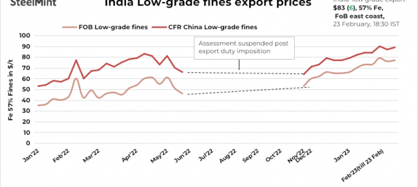 SteelMint’s weekly index of India’s low-grade iron ore fines (Fe 57%) exports stood at $83/tonne (t) FOB east coast on 23 February, 2023, up $6/t w-o-w. Export prices improved on rising futures and spot prices w-o-w along with positive buying interest amid falling steel margins in China.