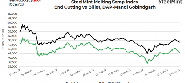 SteelMint’s domestic steel scrap (end-cutting) index decreased by INR 200/tonne (t) to INR 43,300/t DAP Mandi Gobindgarh on 10 January, 2023.