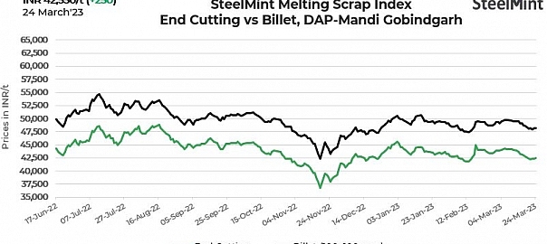 SteelMint’s domestic scrap (end-cutting) index edged up by INR 250/t d-o-d to INR 42,550/tonne (t) DAP Mandi Gobindgarh on 24 March, 2023. The index rose slightly despite slowdown in trade activities even as liquidity issues persisted in the market.