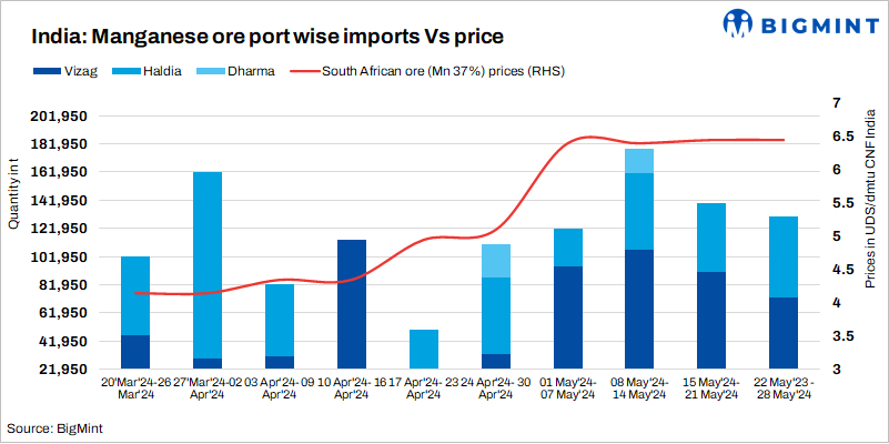Weekly arrivals of imported cargoes fall by 7% w-o-w: Manganese ore cargo arrivals in India witnessed a decrease of 22% for Mn 37%, Mn 44%, and Mn 46 grades. This comes after a previous week with higher volumes, with weekly shipments reaching 130,185 t between 22 to 28 May, 2024, compared to 139,539 t. This decline reflects a shift in buying patterns by smelters, who are now strategically acquiring lower volumes due to an uncertain market outlook.