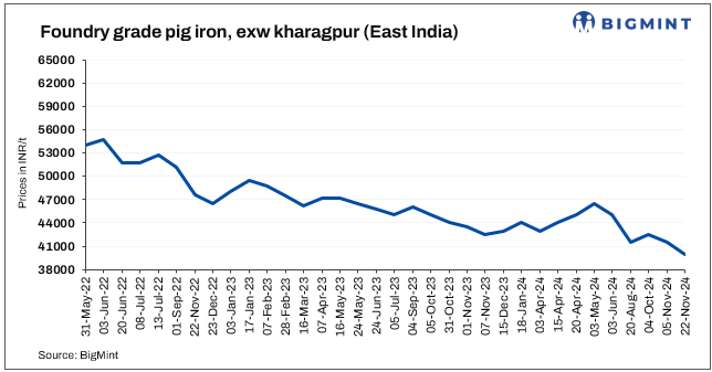 Tata Metaliks has reduced prices of foundry-grade pig iron by INR 1,500/t ($17/t) due to weak demand. This marks the second price cut this month. Post-revision, foundry-grade pig iron was priced at INR 40,000/t ($473/t).