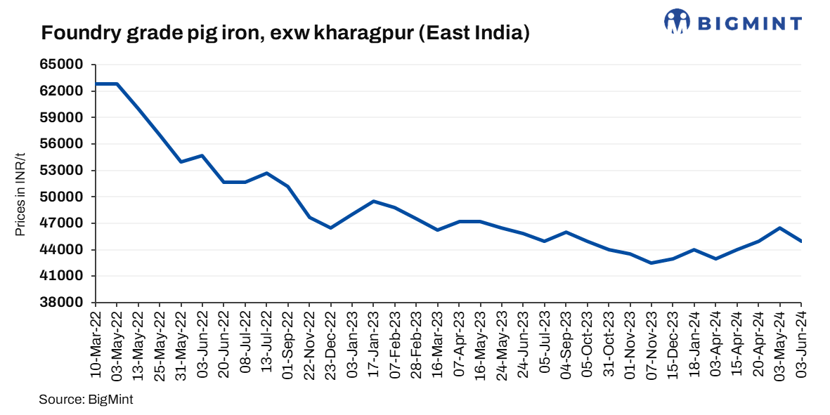 Tata Metaliks has decreased pig iron prices for both basic and foundry grades by INR 1,500/t ($18/t) due to the lack of demand at existing prices. Post-revision, prices of foundry-grade pig iron stand at INR 45,000/t ($541/t), while basic grade (Si 1.0-1.5%) prices are at INR 42,500/t ($511/t). Prices are exw-Kharagpur and applicable for the Kolkata and Howrah markets.