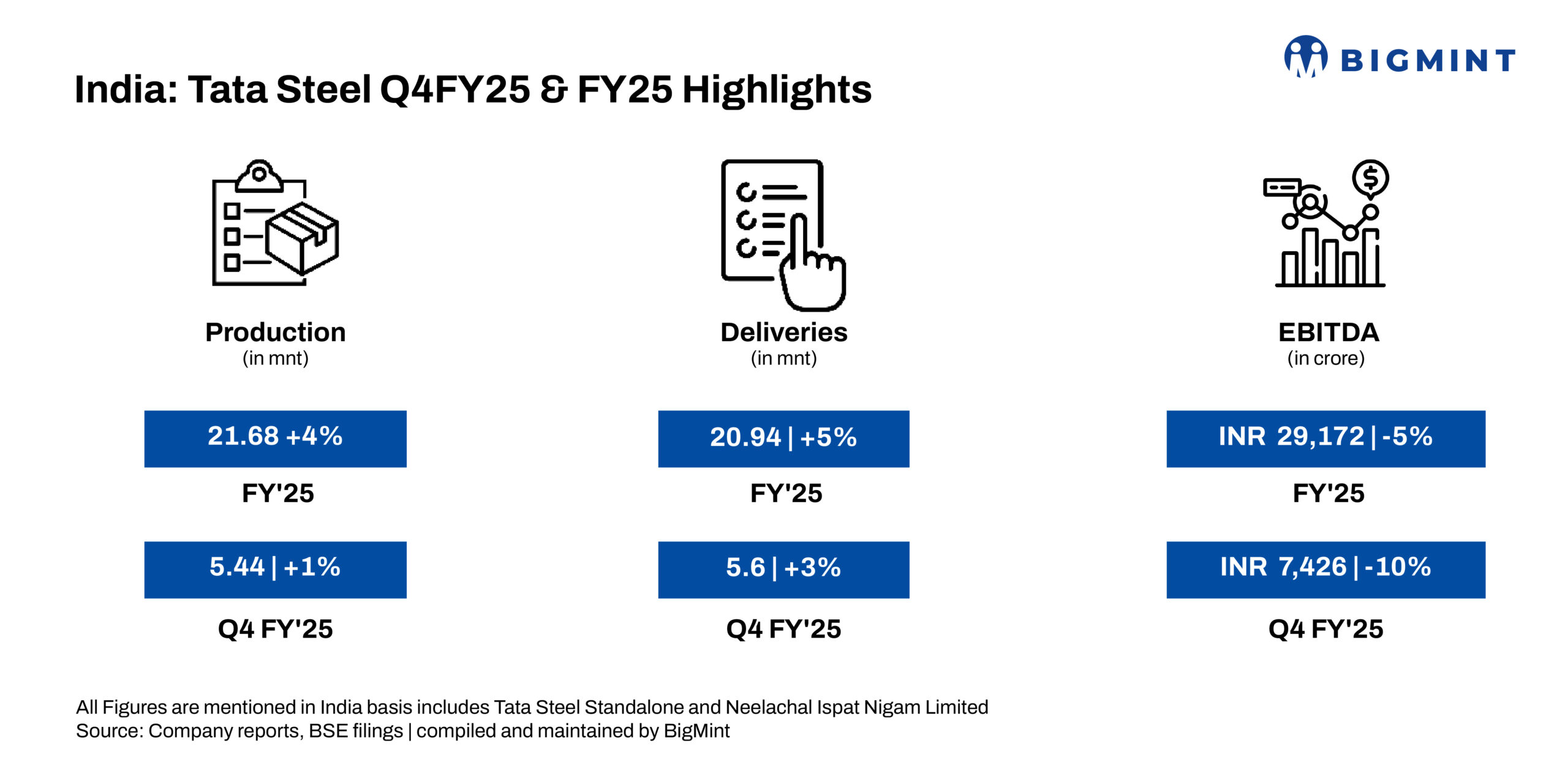 Production rises y-o-y: Tata Steel’s crude steel production rose 4% y-o-y to 21.68 mnt in FY’25 against 20.78 mnt in the same period last year. During Q4FY’25, production edged up 1% y-o-y to 5.44 mnt as compared with 5.40 mnt in Q4FY’24. This was supported by the smooth ramp-up of the new blast furnace at Kalinganagar and near-100% capacity utilisation across other operations.