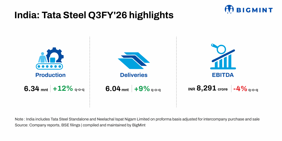 India’s leading private steelmaker, Tata Steel, reported a rise of about 11% in its crude steel production from India operations to 6.34 million tonnes (mnt) in its third quarter ended 31 December 2025, supported by improved operational performance. However, consolidated revenue and EBITDA declined sequentially due to weaker steel realisations, partly offset by higher volumes.