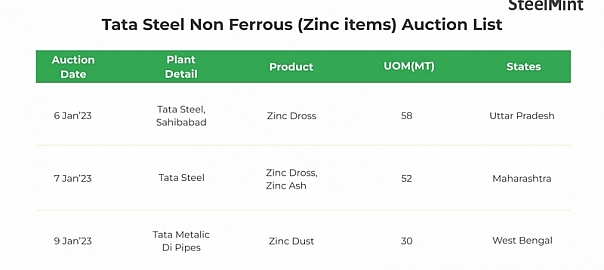 Tata Steel Limited will conduct auctions for around 140 t of zinc items from various locations across India. Of this, 58 t of zinc dross from Uttar Pradesh will be auctioned on 6 Jan’23, 52 t of zinc dross from Maharastra on 7 Jan and 30 t of zinc dust from West Bengal on 9 Jan. The auction will be conducted on the Mjunction platform.