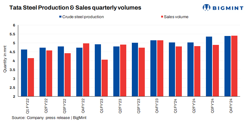 Tata Steel’s crude steel production rose 4% y-o-y to 5.38 mnt in Q4FY’24 as against 5.15 mnt in Q4FY’23. Steel sales increased 5% y-o-y to 5.41 mnt in Q4FY’24 from 5.15 mnt in Q4FY’23. In FY24, crude steel output rose 4% y-o-y to 20.77 mnt and sales recorded 6% growth y-o-y to 19.90 mnt.