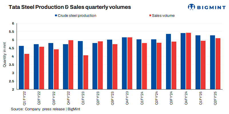 Tata Steel’s production rose 5% y-o-y to 5.27 mnt in Q2FY’25 as against 5.02 mnt in Q2FY’24, while volumes were stable q-o-q from 5.27 mnt in Q1FY’25. The company’s sales volumes increased 6% y-o-y to 5.10 mnt in Q2FY’25 as compared with 4.82 mnt in the CPLY. Similarly, sales rose 3% q-o-q as against 4.94 mnt in Q1FY’25.