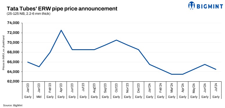 Tata Tubes has reduced list prices by around INR 1,000/t ($12/t) for early-Jul’24 sales. Post-revision, effective prices for base grade ERW pipes (25-125 NB, 2.2-6 mm thickness) stand at INR 64,500/t ($773/t) ex-Jharkhand, excluding GST at 18%. Prices dropped due to decline in raw material costs, slowdown in demand and aggressive pricing from major ERW pipe competitors.