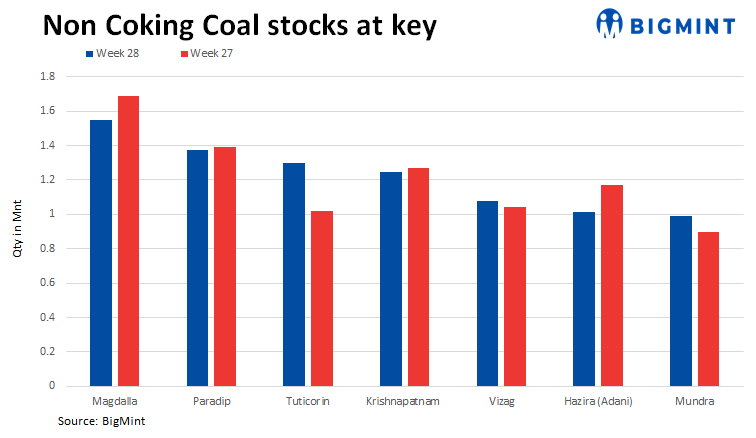 Non-coking coal stocks at Indian ports were around 15.24 million tonnes (mnt) in week 28 against 15.30 mnt in week 27, which decreased by 0.4% w-o-w, as per data compiled with BigMint.