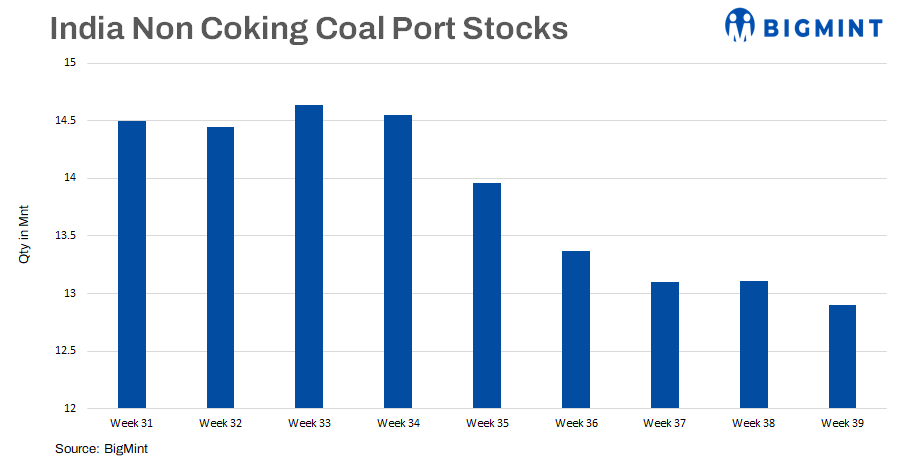 Non-coking coal stocks at Indian ports dipped by 1.6% to 12.90 million tonnes (mnt) in week 39 from 13.11 mnt in week 38, CY’24, according to BigMint’s data.