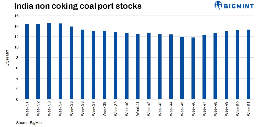 Thermal coal inventories at Indian ports recorded a slight increase of 0.5% to 13.35 million tonnes (mnt) in week 51 from 13.29 mnt in week 50, according to BigMint’s data.