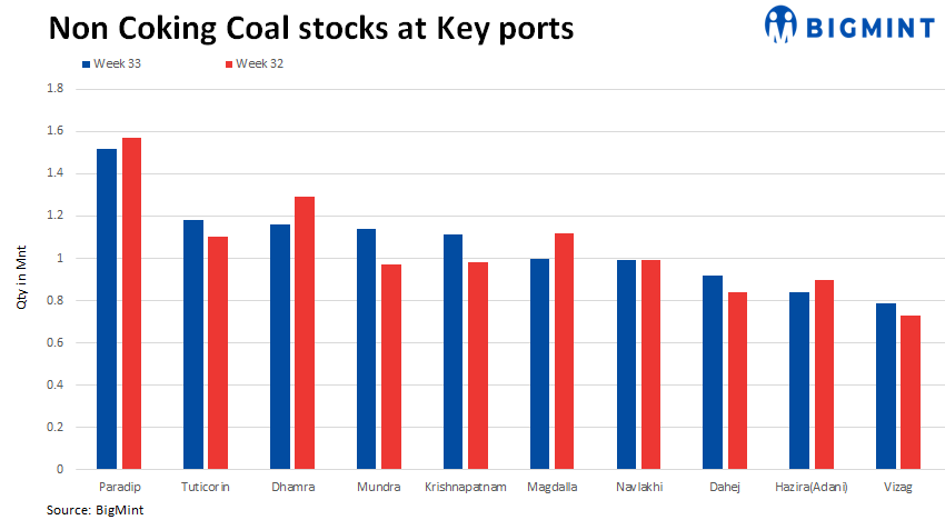 Non-coking or thermal coal stocks at Indian ports were at 14.64 million tonnes (mnt) in week 33 against 14.45 mnt in week 32, stable w-o-w, as per data compiled by BigMint.