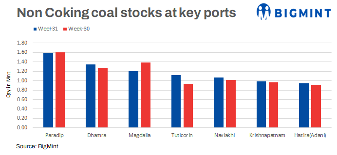 Non-coking or thermal coal stocks at Indian ports were at 14.5 million tonnes (mnt) in week 31 against 14.37 mnt in week 30, stable w-o-w, as per data compiled by BigMint.
