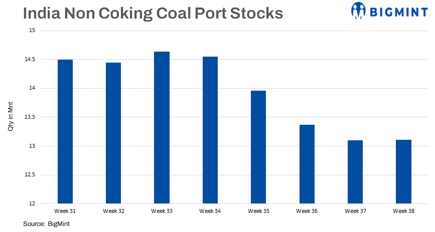 Non-coking or thermal coal stocks at Indian ports were almost unchanged at 13.11 million tonnes (mnt) in week 38 of calendar year 2024 (CY’24) from 13.10 mnt in week 37, as per data compiled by BigMint.