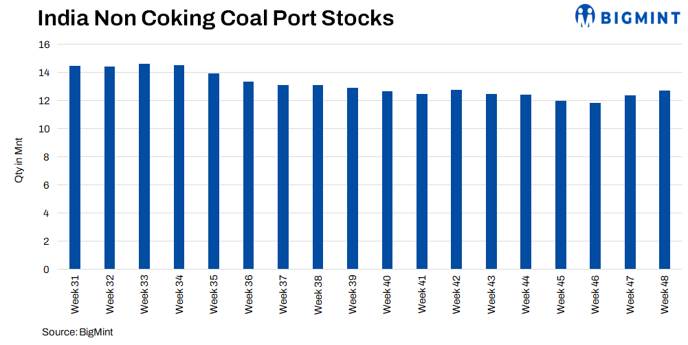 Thermal or non-coking coal stocks at Indian ports increased by 3% to 12.74 million tonnes (mnt) in week 48 from 12.36 mnt in week 47, according to BigMint’s data. This was the second week in a row of increase.