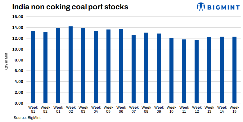 Thermal coal inventories at Indian ports rose slightly by 0.2% w-o-w to 12.33 million tonnes (mnt) in week 15 of CY’25, from 12.31 mnt in the previous week, according to BigMint data. While the overall increase was marginal, several key ports recorded notable changes in stock levels, suggesting a shift in cargo movement and arrivals during the week.