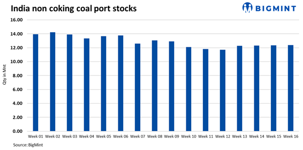 Thermal coal inventories at Indian ports remained largely stable w-o-w, edging up by 0.3% to 12.37 million tonnes (mnt) in week 16 of CY’25, from 12.33 mnt in the previous week, as per BigMint data. The steady trend indicates balanced vessel discharge and inland offtake, with moderate changes at a few ports.