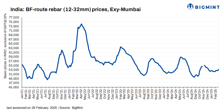 1. IF rebar prices rise m-o-m: IF rebar trade prices rose m-o-m across markets amid moderate demand and improved bookings. Manufacturers increased prices but offered trade discounts due to buyer resistance. Inventory idling time reduced to 10-12 days. Sponge iron and billet prices also increased m-o-m. As per BigMint, IF rebar prices rose by INR 800/t ($9/t) m-o-m to a monthly average of INR 47,900/t ($550/t) exw-Mumbai in February 2025.