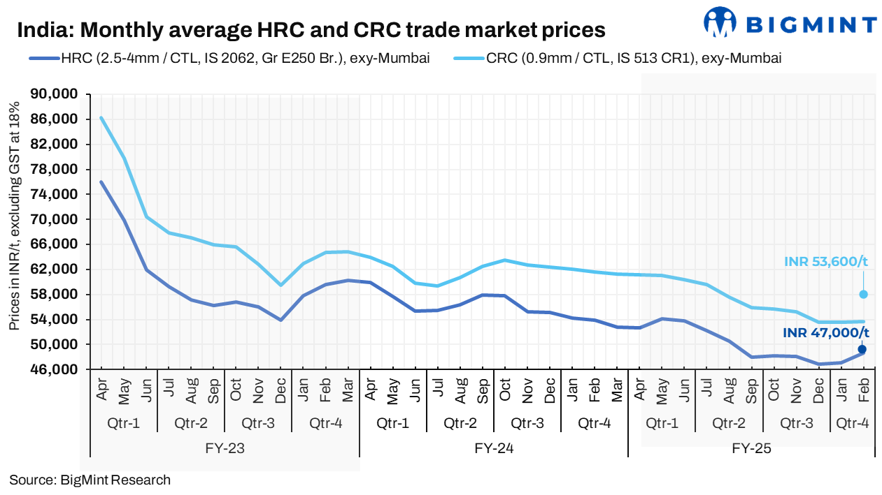 BigMint’s benchmark assessment prices (bi-weekly) of HRCs (IS2062, Gr E250, 2.5-8 mm) increased margnally by INR 200/t w-o-w to INR 48,700/t ($543/t). However, CRCs (IS513, Gr O, 0.9 mm) remained stable at INR 53,700/t, respectively, on 4 February 2025. The prices quoted are exy-Mumbai, exclude 18% GST, and are for cut-to-length (CTL) deliveries.