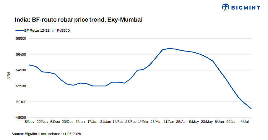 Trade-level BF rebar prices declined by INR 700/tonne (t) ($8/t) w-o-w to INR 49,200/t ($573/t) exy-Mumbai, as per BigMint’s assessment on 11 July 2025. Prices are exclusive of GST at 18%.