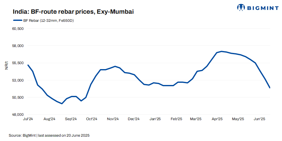 Trade-level BF rebar prices declined by INR 1,300/t ($15/t) w-o-w to INR 51,900/t ($599/t) exy-Mumbai, as per BigMint’s assessment on 20 June 2025. Prices are exclusive of GST at 18%.