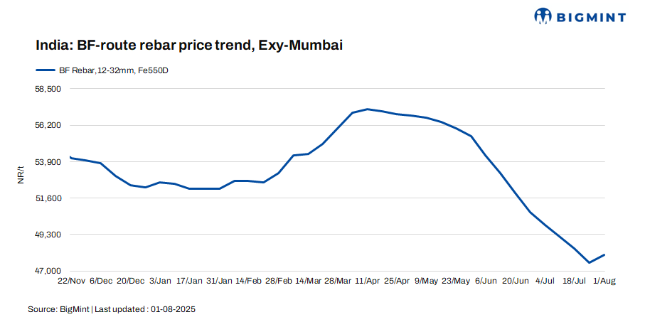 Trade-level BF rebar prices increased by INR 500/tonne (t) ($6/t) w-o-w to INR 48,000/t ($549/t) exy-Mumbai, as per BigMint’s assessment on 1 August 2025. Prices are exclusive of GST at 18%.