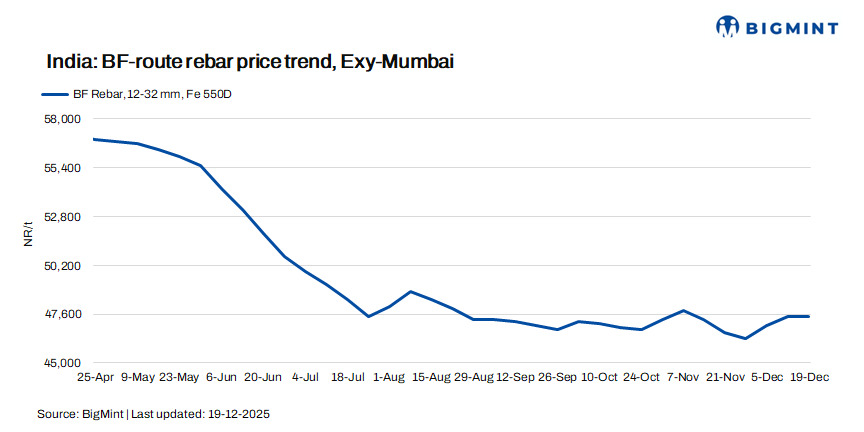 Trade-level BF rebar prices were unchanged w-o-w at INR 47,500/t ($527/t) exy-Mumbai, as per BigMint’s benchmark assessment on 19 December 2025. Prices are exclusive of GST at 18%.